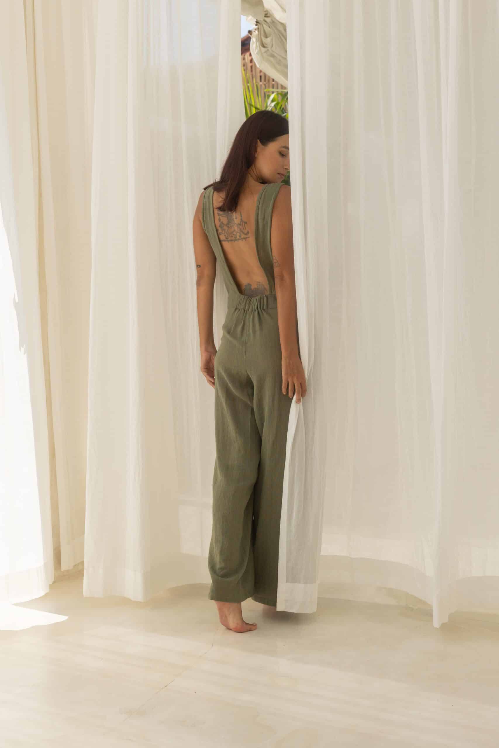 Article en production – Expédition à partir du 15 SEPTEMBRE Cette combinaison pantalon en ramie se distingue par son allure élégante et cette jolie couleur olive. Elle présente une coupe ample et fluide, avec un pantalon coupe droite assurant un confort optimal. Le dos nu plongeant carré ajoute une touche de sensualité et de modernité. Il y a une partie élastique en bas du dos. La matière en ramie, naturellement texturée, confère une sensation légère et respirante, idéale pour l’été. C’est une pièce à la fois décontractée et raffinée, parfaite pour un look estival chic. Couleur : olive  Matière : 100% ramie La mannequin fait 1,72M et porte une taille unique Tous nos articles sont imaginés et conçus à Bali dans nos ateliers. Sachez que nous portons une attention particulière quant au choix du tissus qui est teinté et lavé avant la conception de nos modèles Ramie La Ramie est un tissu naturel Ramie a une fibre de cellulose, obtenue par un processus d’extraction complexe, ce qui en fait un tissu coûteux et haut de gamme. Ses fibres sont obtenues à partir des plantes Boehmeria Nivea et Utilis : la ramie blanche est obtenue à partir de la première, tandis que la ramie verte est obtenue à partir de la seconde. La fibre végétale du ramie est totalement naturelle, tout comme le lin ou le bambou. Ses fibres sont utilisées pour la conceptions de vêtements légers et résistants. La toile de ramie possède une bonne perméabilité à l’air, assure un transfert de chaleur rapide, une grande capacité d’absorption de l’humidité, et donc porter des tissus de ramie l’été garantit une sensation de fraîcheur. Entretien : Le lavage à la main est la meilleure et la plus sûre méthode pour entretenir la ramie.  De l’eau froide et votre produit de lavage suffira. Immergez l’article et agitez doucement l’eau avec vos mains pour répartir uniformément le savon. Laisser tremper jusqu’à 30 minutes. Rincez bien en faisant couler de l’eau froide à travers l’article jusqu’à ce que l’eau ne soit plus savonneuse. Ne pas tordre/essorer la matière. Au lieu de cela, pressez doucement et faites sortir le surplus d’eau Sécher à l’air libre à plat. Nous recommandons le défroissage vapeur oui avec fer à repasser en température très basse.