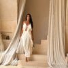 Le pantalon présente une coupe fluide avec un pan croisé sur le devant, maintenu par de fins liens à nouer, et une fermeture zip discrète pour un ajustement parfait. Le long top, confectionné dans un voile de coton léger, se noue à l’avant et dévoile un mouvement naturel à chaque pas. Ses volants subtils apportent une touche de douceur et d’élégance intemporelle.