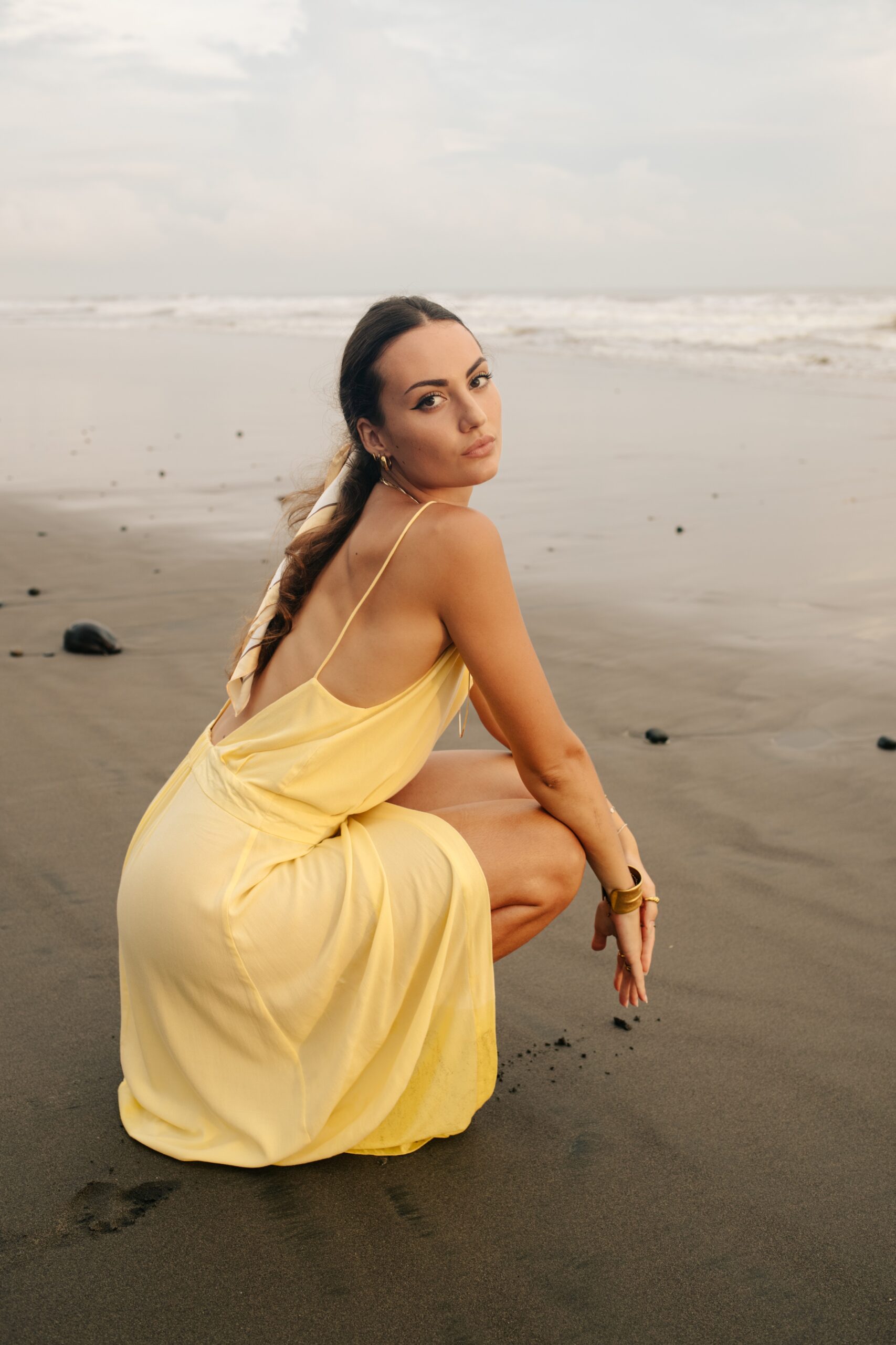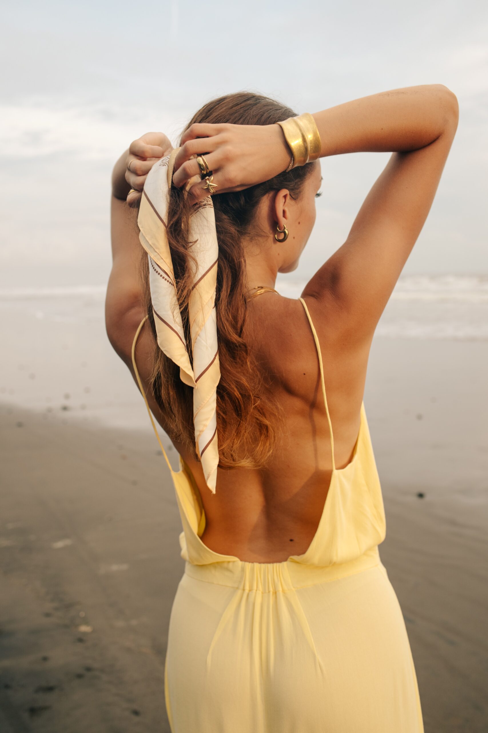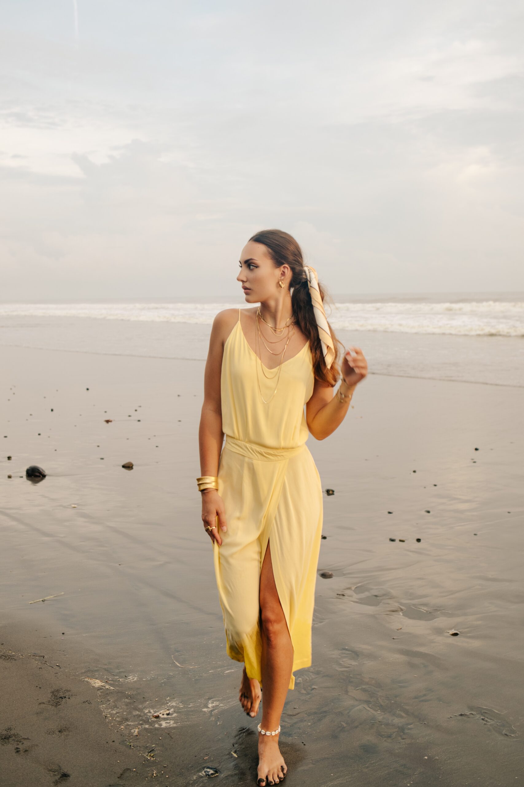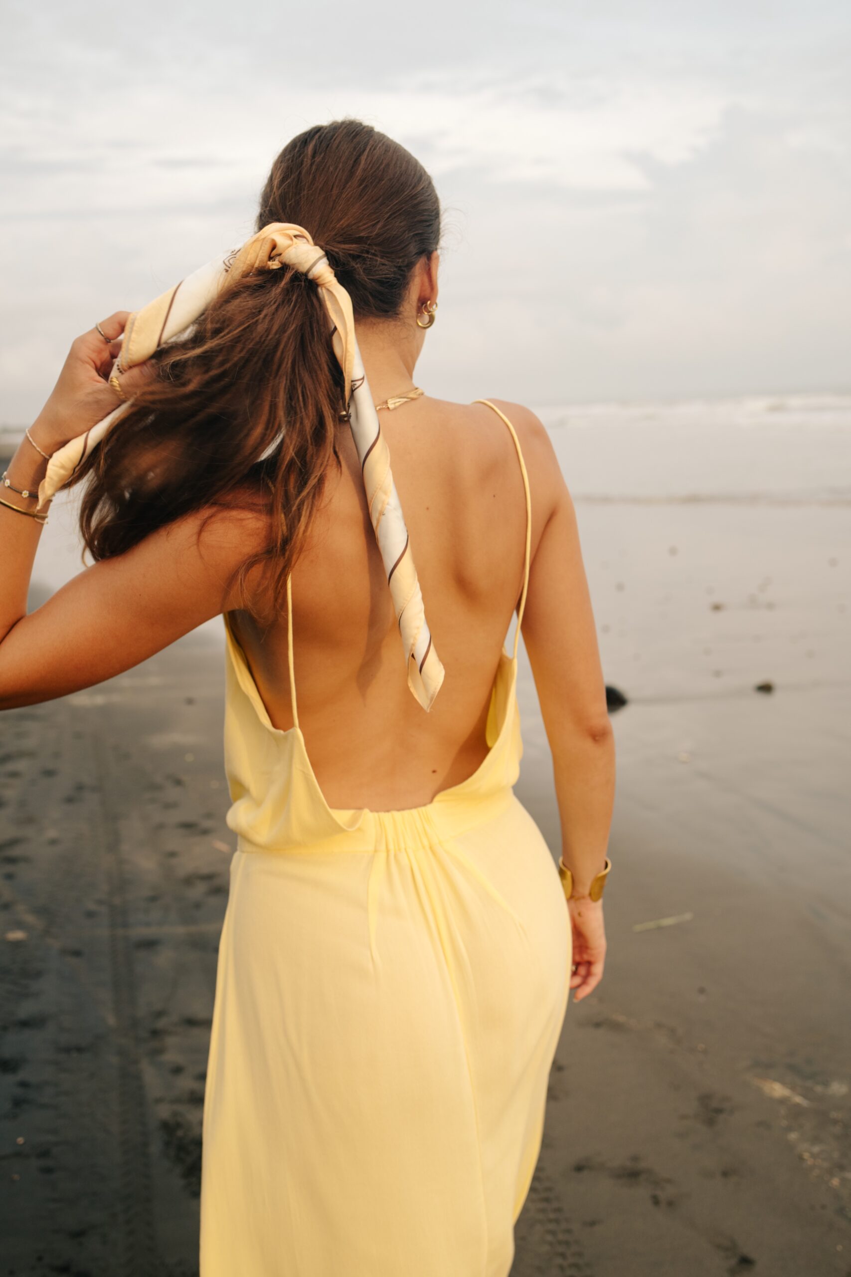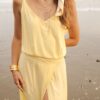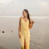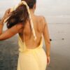 Robe longue à fine bretelles avec fente croisée et un dos nu renversant. Fluide, légère, élégante et d’une couleur jaune pale sublime, c’est l’un des modèles coup de cœur de la collection. Son magnifique dos nu est également repris pour la combinaison ORA. Matière : Viscose georgette La mannequin fait 1,72M et porte une S.