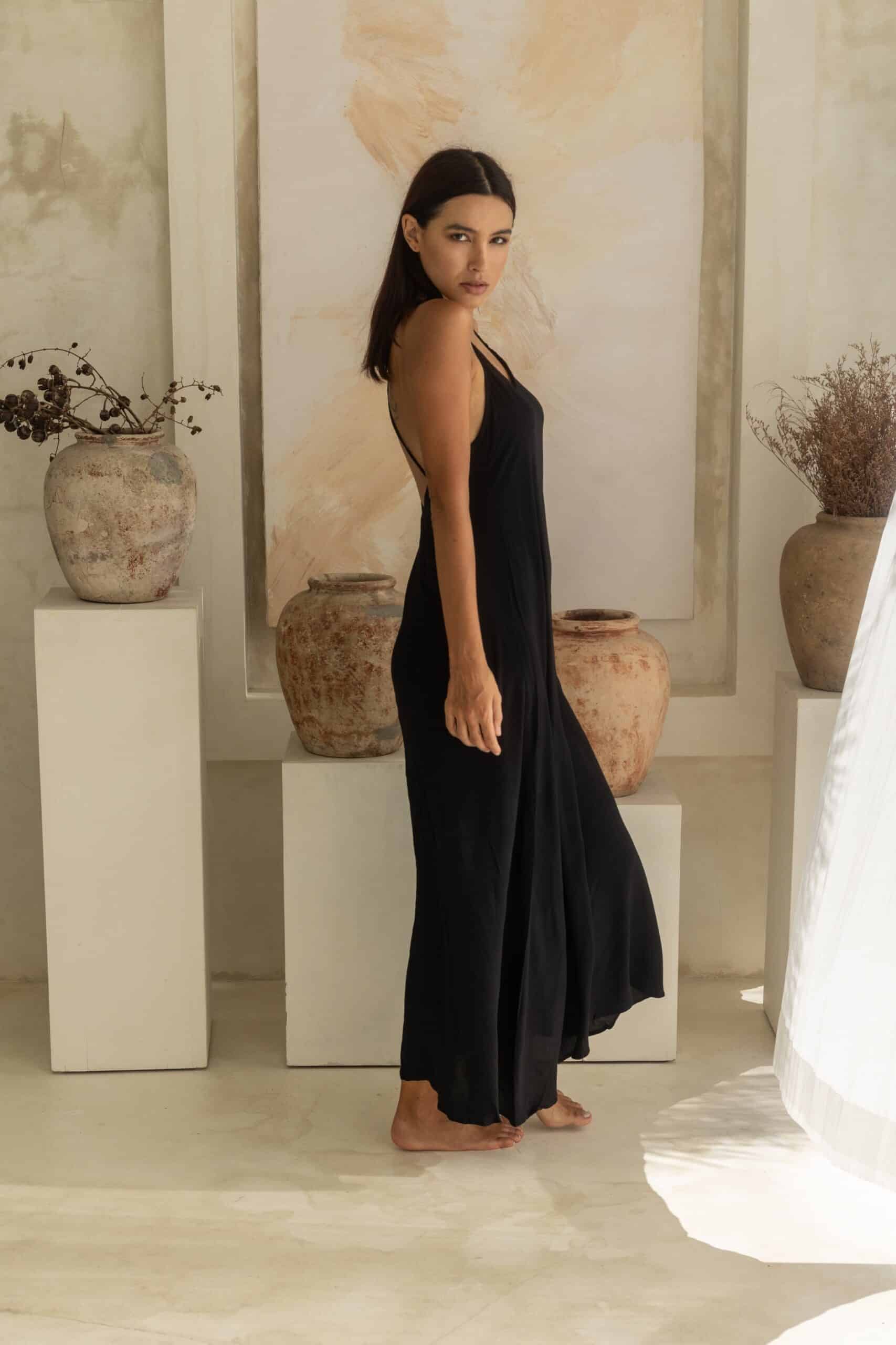 Robe longue évasée à fines bretelles avec un joli dos nu. Les bretelles dans le dos se rejoignent à la nique grace à un bouton ce qui en fait un joli détail. La robe est fluide et légère avec un léger décolleté en V sur l’avant.  Existe aussi en version courte.  Couleur : noire Matière : rayonne fujet La mannequin fait 1,76M et porte une taille unique Tous nos articles sont imaginés et conçus à Bali dans nos ateliers. Sachez que nous portons une attention particulière quant au choix du tissus qui est teinté et lavé avant la conception de nos modèles