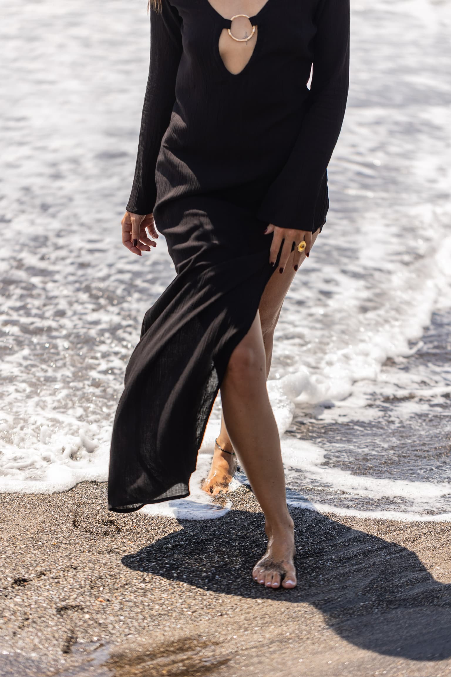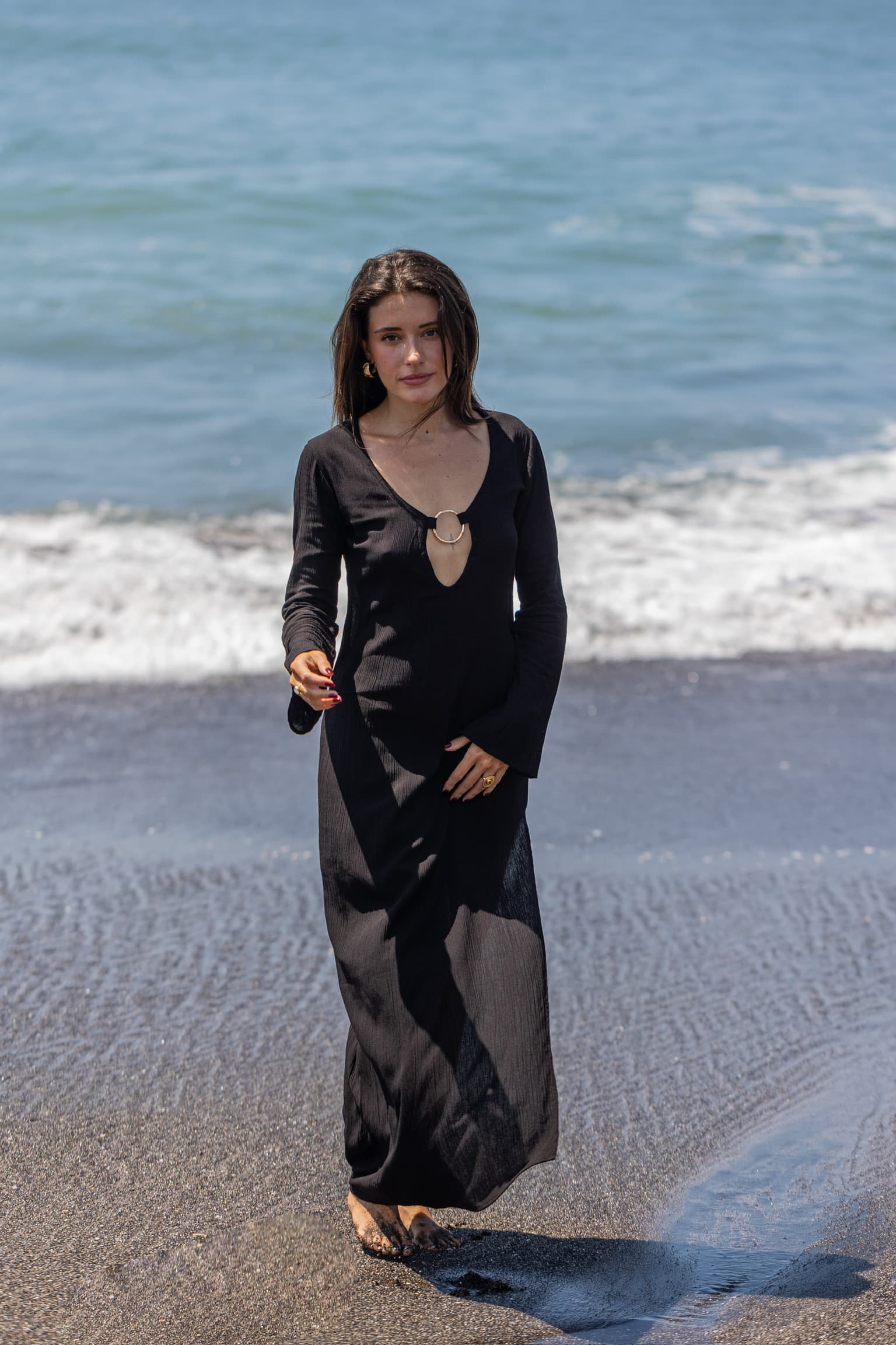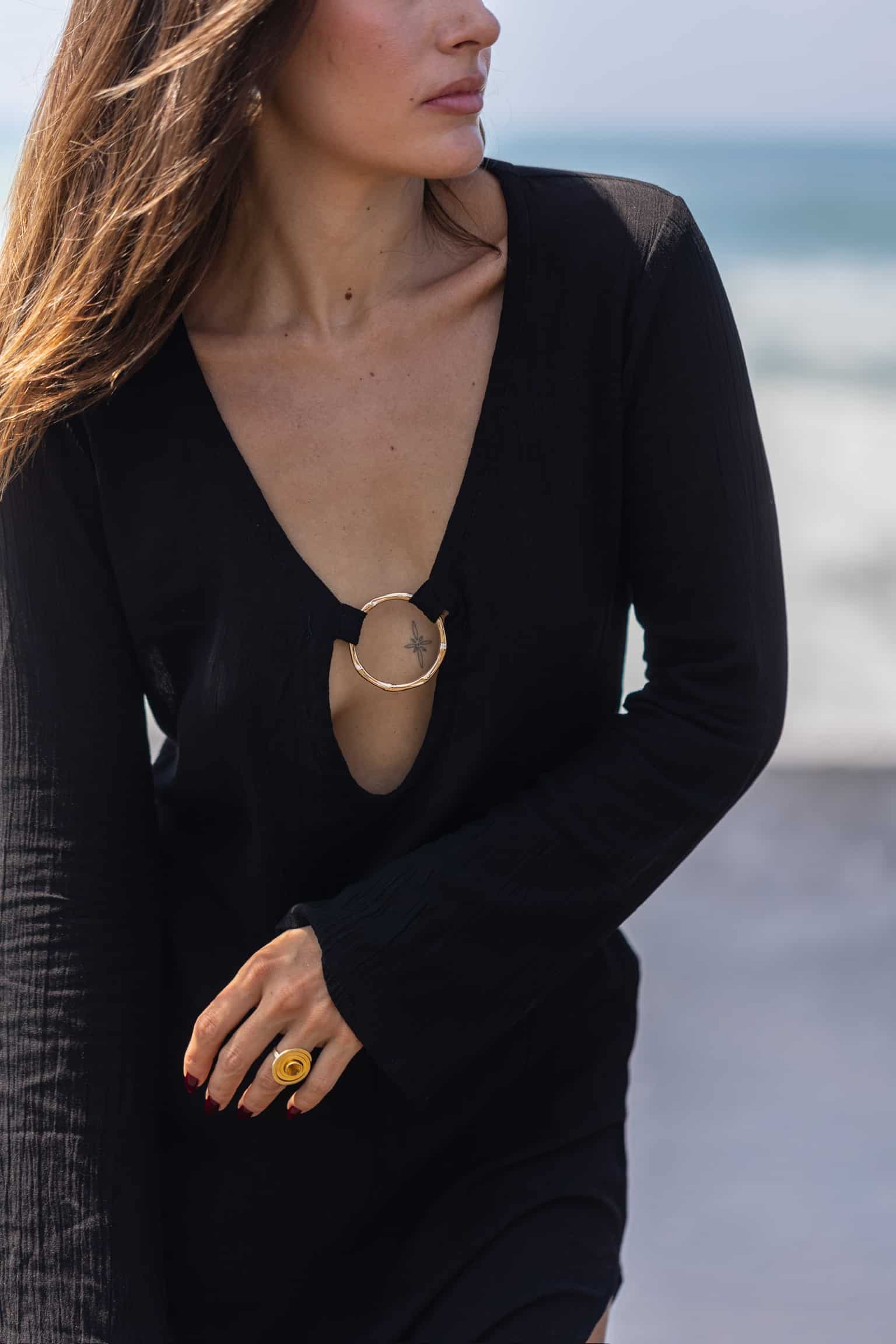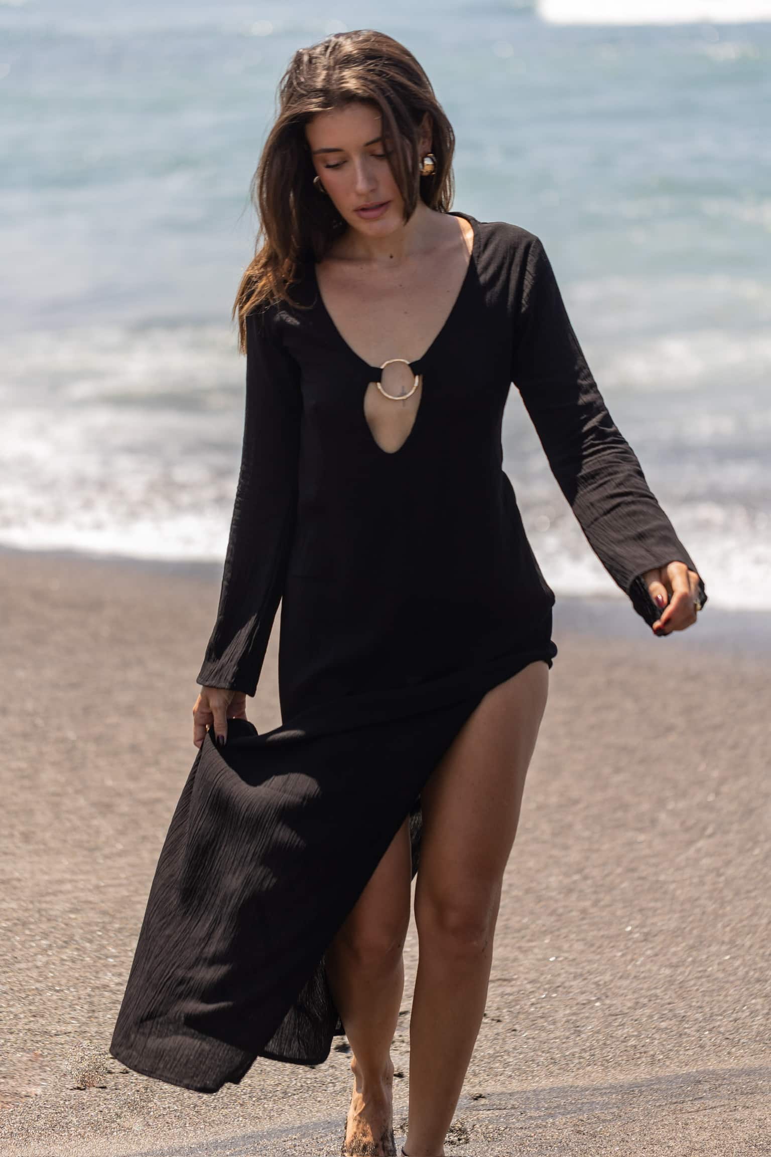 Robe longue à manches longues avec anneaux dorés inoxydables au décolleté Maxi fente au niveau des cuisses sur la jambe gauche Manches légèrement évasées Tissu léger et agréable Matière : Rayonne de crêpe La mannequin fait 1,69 m et porte une taille SM Tous nos articles sont imaginés et conçus à Bali dans nos ateliers. Sachez que nous portons une attention particulière quant au choix du tissu qui est teinté et lavé avant la conception de nos modèles.